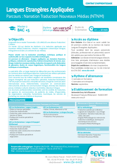 - Le parcours « Administration de la musique et du spectacle vivant », ou « AMSV » (UEVE) forme les étudiants aux besoins diversifiés de structures artistiques professionnelles, musicales, théâtrales ou autres. Il s’adresse aux futurs administrateurs, chargés de projets, coordinateurs d’orchestres, de compagnies de théâtres ou de lieux de spectacles, à des responsables de secteur (musique actuelle, musiques du monde) dans les antennes culturelles liées au territoire, scènes de musiques actuelles, direction d’ADDIM, d’ADIAM, ARIAM. Il propose une formation musicologique, juridique, historique, les préparant à l’exercice de ces professions.